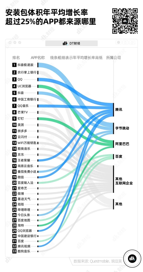如果你仔细观察也会发现,许多安装包飞速变大的APP,其实来源于头部互联网大厂,或者是由它们控股:腾讯旗下有微信、QQ、王者荣耀、QQ音乐……阿里巴巴有淘宝、支付宝、钉钉、UC浏览器……字节跳动有抖音、今日头条……