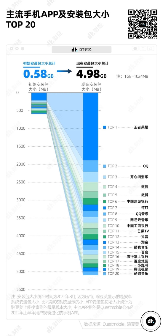 如果只看排名前20的APP,它们的安装包体积和从0.58GB变成了4.98GB,大概是原来的8倍。
