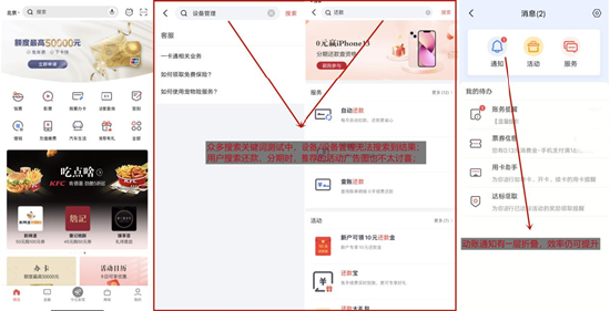 从App发展的角度看,招商银行掌上生活8.0版App不断更新迭代,并上线了“大字版”。从用户体验维度看,App整体交互顺畅、操作流畅,不过也有瑕疵之处,比如搜索关键词测试中“设备管理”无法搜到结果,个别安卓机型出现不兼容的情况;从功能服务维度看,App功能服务比较完善,各类品牌活动也较有吸引力,但个别细节也可优化——比如,申卡时个别信用卡缺乏相关信息提示,积分账单不够详细。