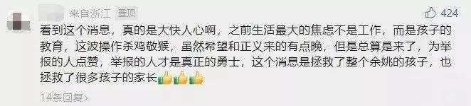 “ 看到这个消息,真的是大快人心啊 ,之前生活最大的焦虑不是工作,而是孩子的教育,这波操作杀鸡儆猴,虽然希望和正义来的有点晚,但是总算是来了,为举报的人点赞, 举报的人才是真正的勇士,这个消息是拯救了整个余姚的孩子,也拯救了很多孩子的家长。 ”