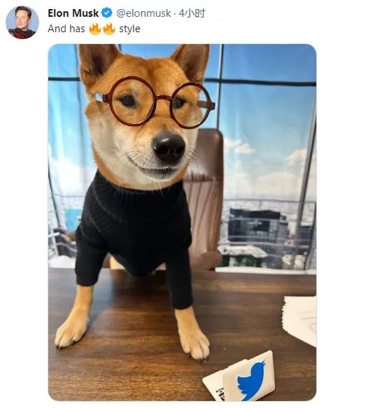 马斯克在这张照片下评论道:“推特的新任CEO太棒了。”配图上是一只穿着印有“CEO”字样T恤的柴犬坐在办公桌前,桌子上还放着印有推特Logo的签名文件,上面有爪印形的“印章”,“名字”一栏写的是“弗洛基”(Floki)。马斯克回复网友时补充道:“它非常适合这份工作。”“比其他家伙强多了!”马斯克随后又发文称,“它对数字很在行”,新的配图上,这只柴犬戴上了眼镜,桌上又多了几份文件材料。“还有火的潜质。”他接着发文称。