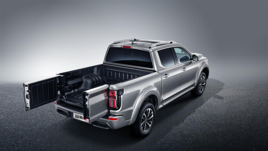 除了外观和内饰,山海炮的后尾箱也很有亮点。比如它的后栏板可以按照4/6比例横向打开,和一般的皮卡不一样,这点算是创新,可以更方便地上下货厢。当然它也可以像普通皮卡那样将整个栏板打开,过程中还带有阻尼感。货厢内铺满防刮防水材料,而且左右两侧的区域埋有多个锚点。