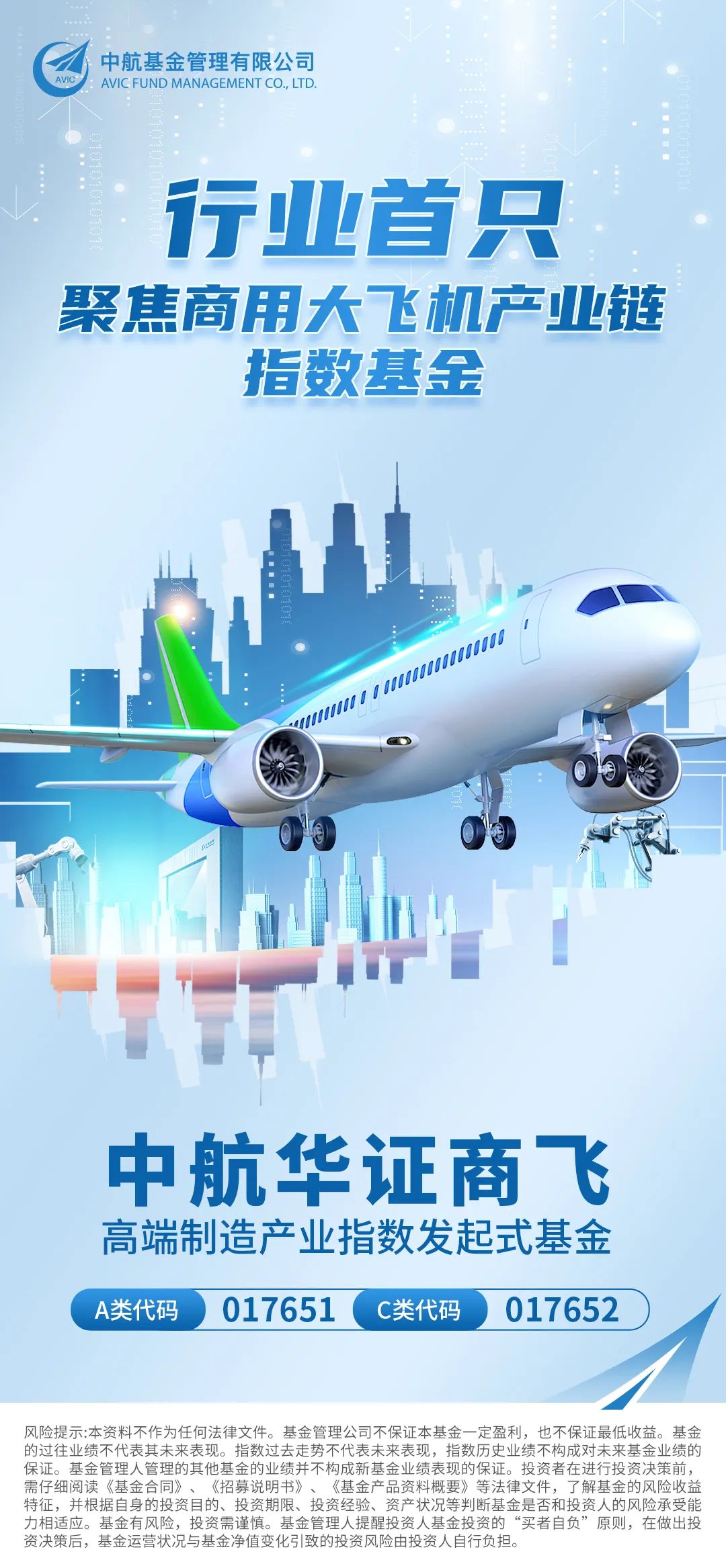 中航华证商飞高端制造产业主题指数基金近日在各大渠道正式发售,该产品为市场上首只聚焦国产商用大飞机产业链的指数基金,指数成分股主要为整机制造商及核心供应商,以追踪A股市场商用大飞机产业相关上市公司的整体表现。中航基金作为市场上首家推出跟踪该指数产品的基金管理人,也将中航华证商飞高端制造产业主题指数基金作为开年首只权益产品放在了重要地位,该产品不仅为投资者提供了一键布局国产大飞机行业的指数化投资工具,也是其坚定走“创新·引领”发展道路的体现。