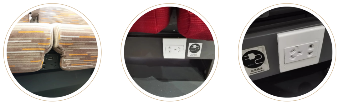 旅途时间长,手机需要充电怎么办?高铁列车配备充电口,不同车型各有不同,您可以看一下。两个座椅中间,车厢两端墙壁下方,座椅背面下方,座椅正面下方。