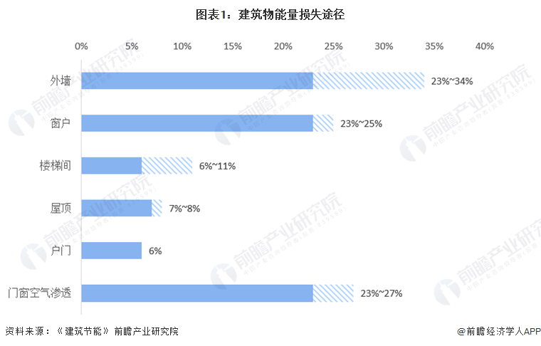 从建筑物能量损失途径分析,外墙和窗户是建筑能耗的重点关注领域,其中,外墙能量损失占比约为23%-34%;窗户能量损失约在23%-25%,其他如屋顶能量损失约为7%-8%,户门约6%。