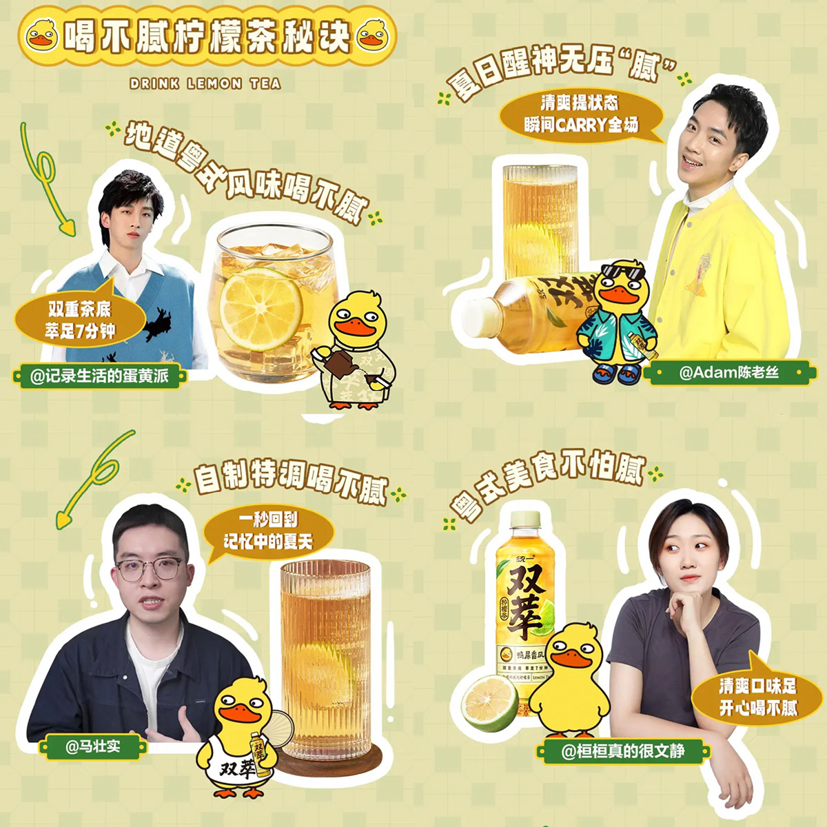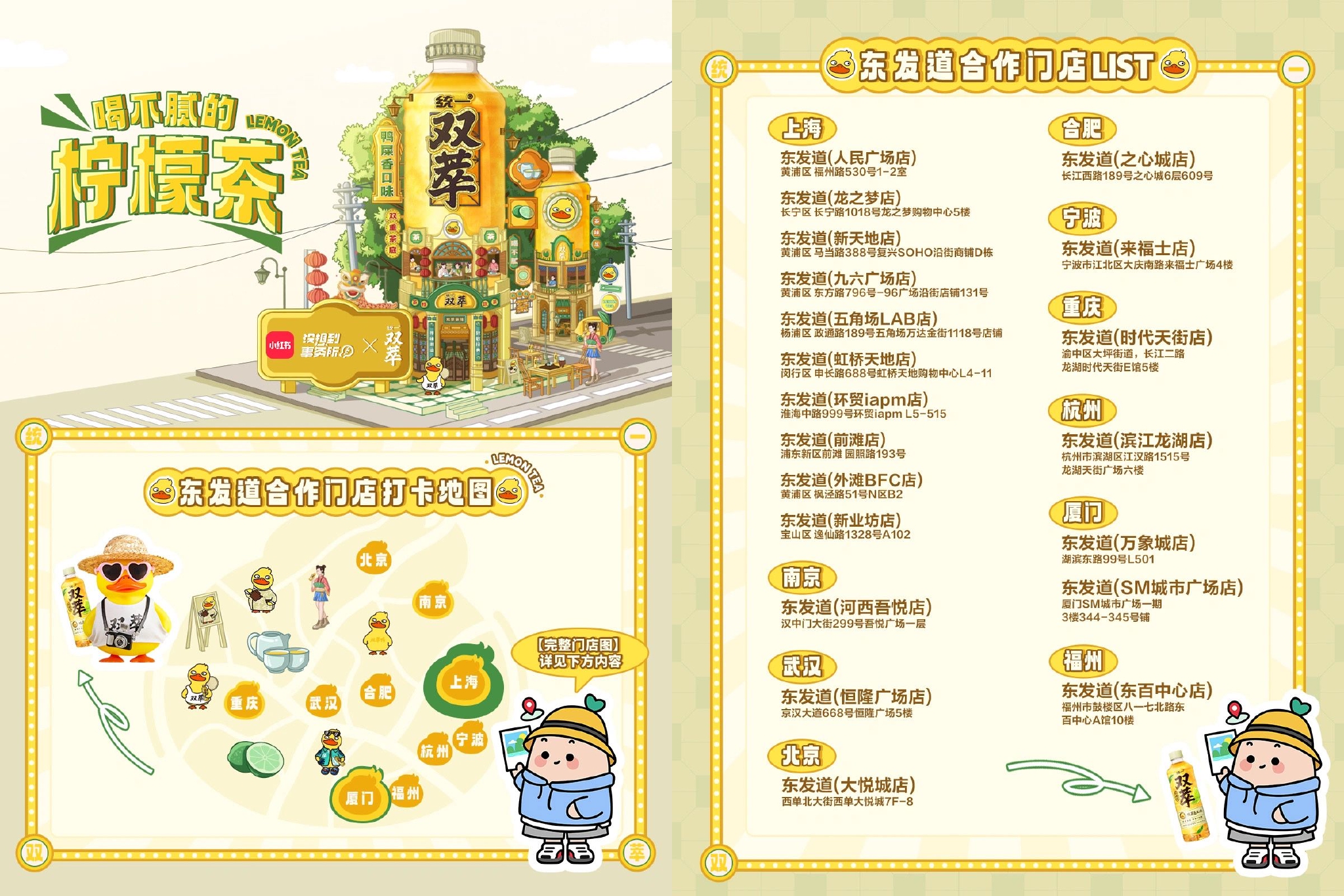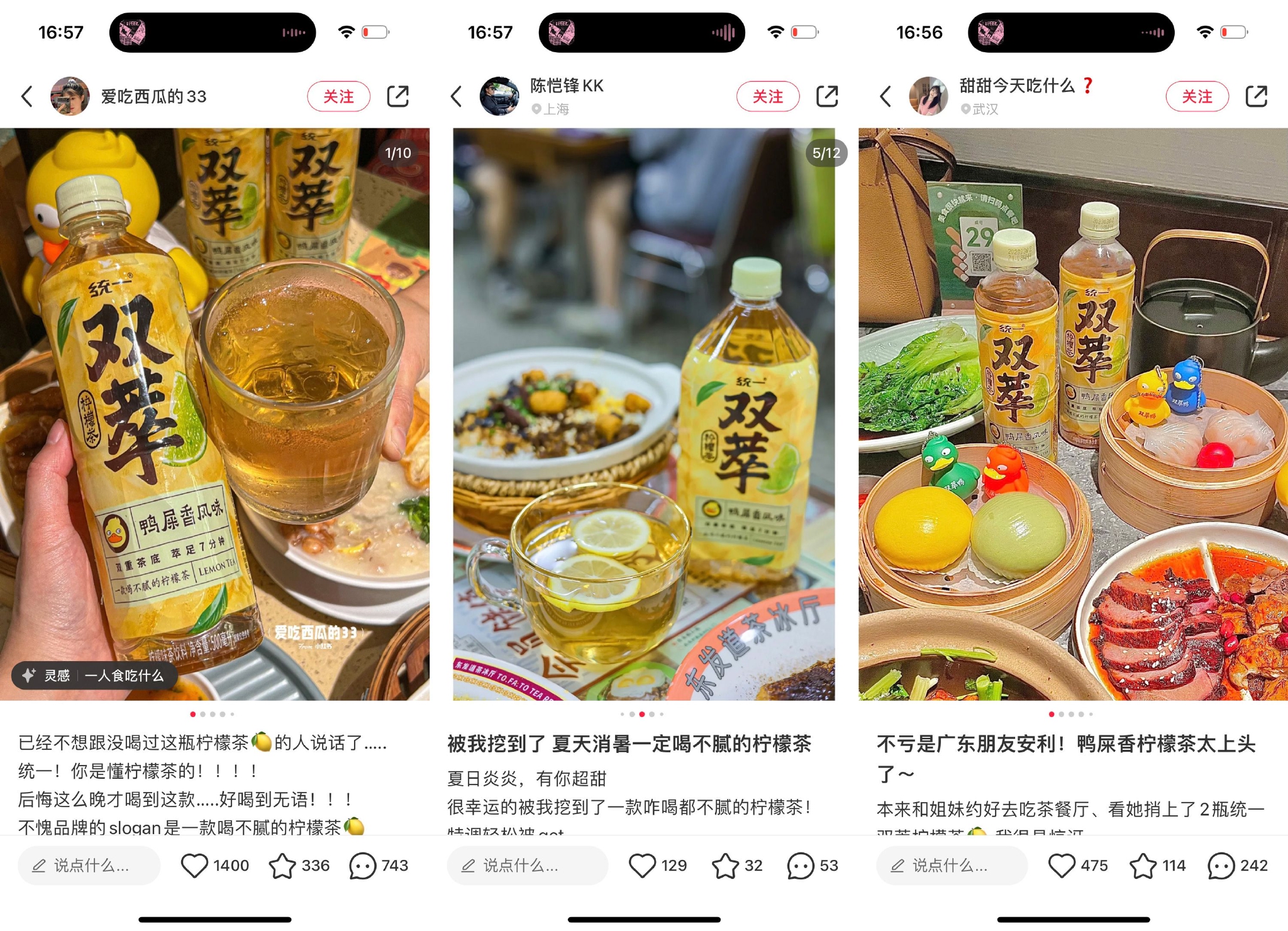 此次东发道城市地图包含上海、南京、厦门、武汉、合肥、北京、杭州、宁波、重庆、福州等十个城市,当地达人和种草官们纷纷出动,开启打卡模式。不少种草达人表示被吸管上的“小红薯”和“双萃鸭”萌翻了!在口味方面,食客们也给出了好评:“漏奶华甜而不腻,冻柠茶茶香浓郁、清凉爽口”、“冻柠茶味道地道,适合炎热夏季,漏奶华奶香味儿浓郁”、“夏天的快乐,是统一双萃给的”……