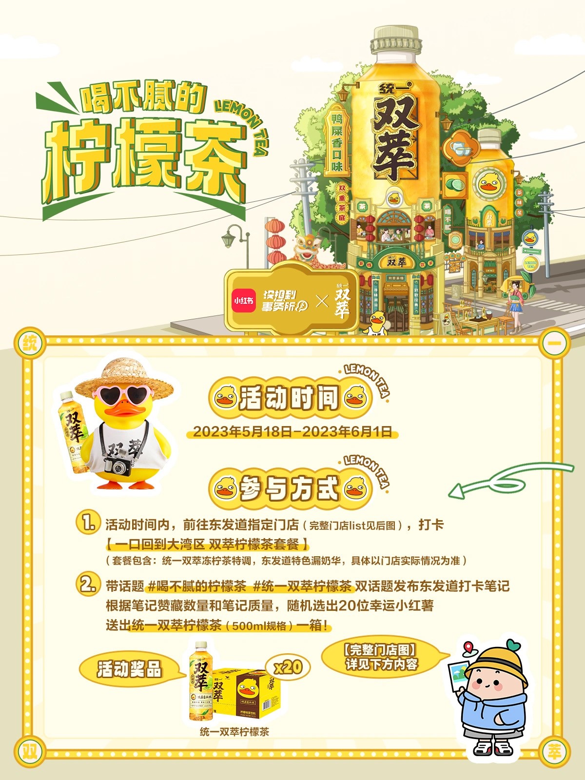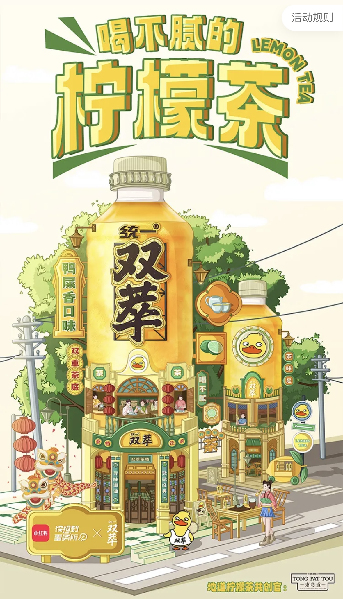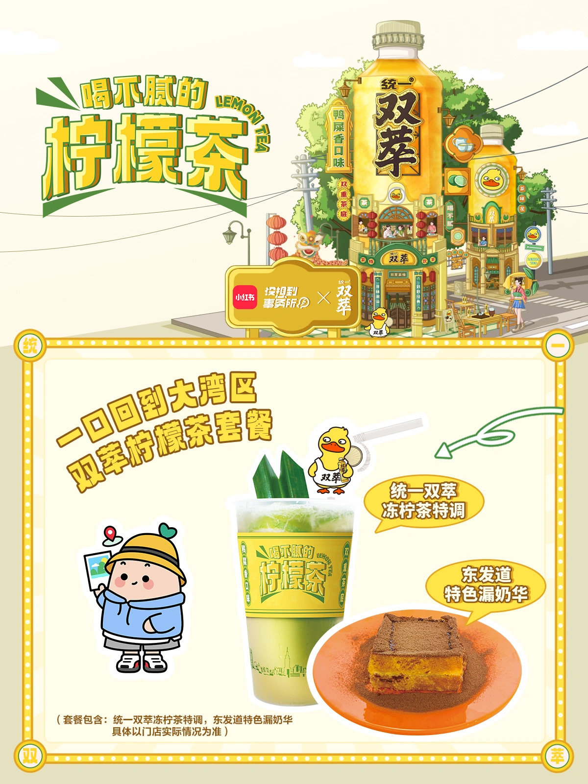 小红书联合统一双萃柠檬茶,携手地道柠檬茶共创官东发道茶餐厅,共创「一口回到大湾区,双萃柠檬茶套餐」。套餐包含统一双萃冻柠茶特调和东发道特色漏奶华两款产品。