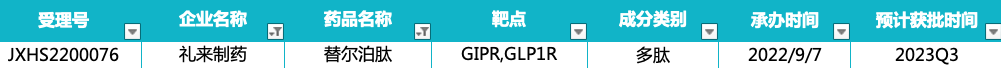 2022年9月,礼来制药的GLP-1R/GIPR双重激动剂「替尔泊肽注射液」2型糖尿病适应症在国内申报上市(受理号:JXHS2200075/6/7/8)。