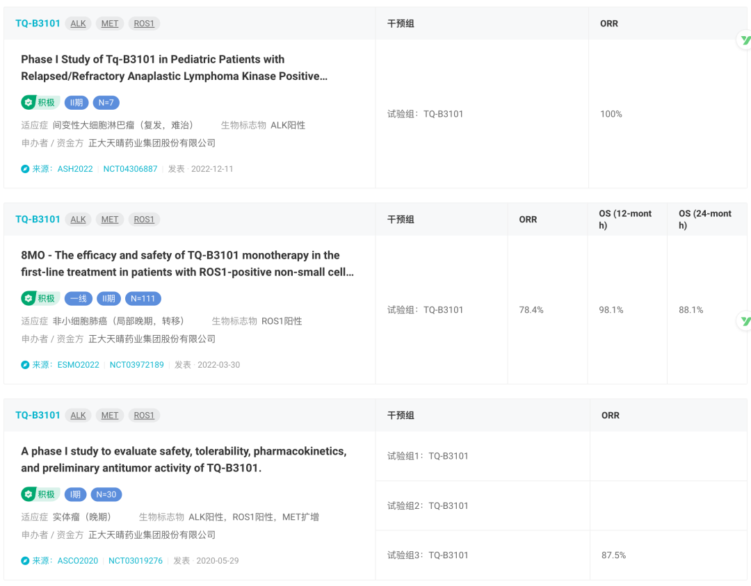 此前正大天晴曾披露TQ-B3101一线治疗ROS1阳性NSCLC的II期临床数据(登记号:NCT03972189),结果显示,独立评审委员会(IRC)评估的ORR为78.4%(95%CI,69.6-85.6),mPFS为15.6个月(95%CI,10.2-27.0)。