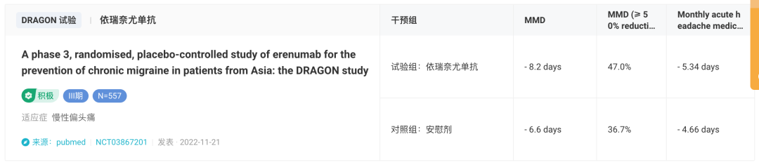 2021年3月,诺华宣布DRAGON III期研究取得积极结果达到主要终点。这是一项随机双盲、多中心、安慰剂对照的III期临床试验,旨在评估Erenumab预防性治疗成人慢性偏头痛的有效性和安全性。该研究共入组557例患者,以亚洲为中心、中国人群为主。