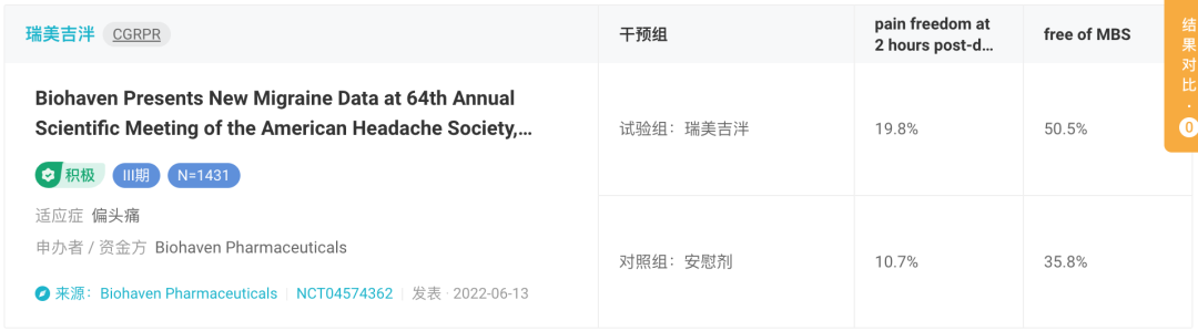 2022年2月,Biohaven和辉瑞共同宣布Rimegepant用于治疗急性偏头痛的3期临床试验达到了有效性和安全性的共同主要终点。这是Rimegepant用于急性偏头痛治疗的第4个积极3期临床研究,同时也是首个在亚太地区进行的研究。