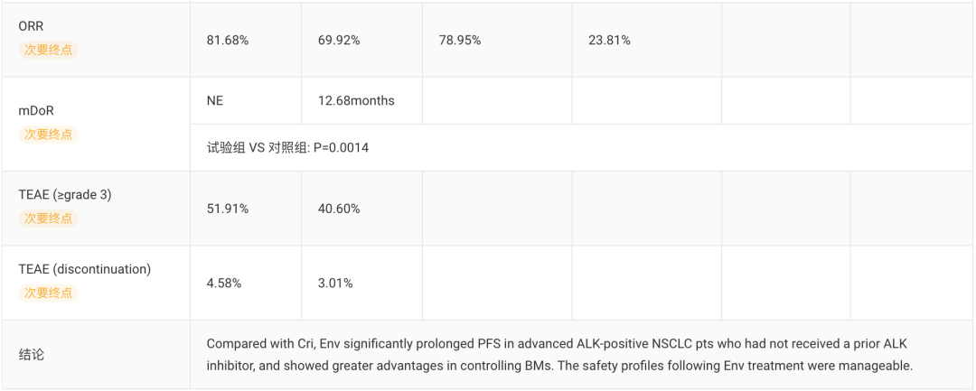 结果显示,依奉阿克组mPFS(IRC评估)显著优于克唑替尼(NRvs11.89m;HR=0.46,p<0.0001),合并TP53突变的患者同样可以从依奉阿克治疗中获益(mPFS:11.93mvs7.85m,HR=0.47)。IRC评估的ORR为81.68% vs69.92%,同时依奉阿克组具有更持久的疗效(mDoR:NRvs12.68m,p=0.0014)。