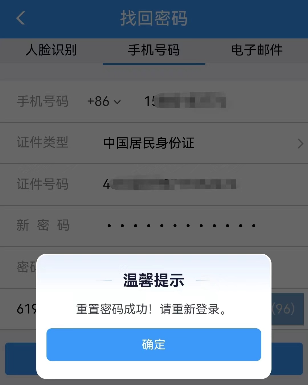 输入注册时所用的手机号、证件号码等信息,填写新密码并获取验证码,提交后即可启用新密码。