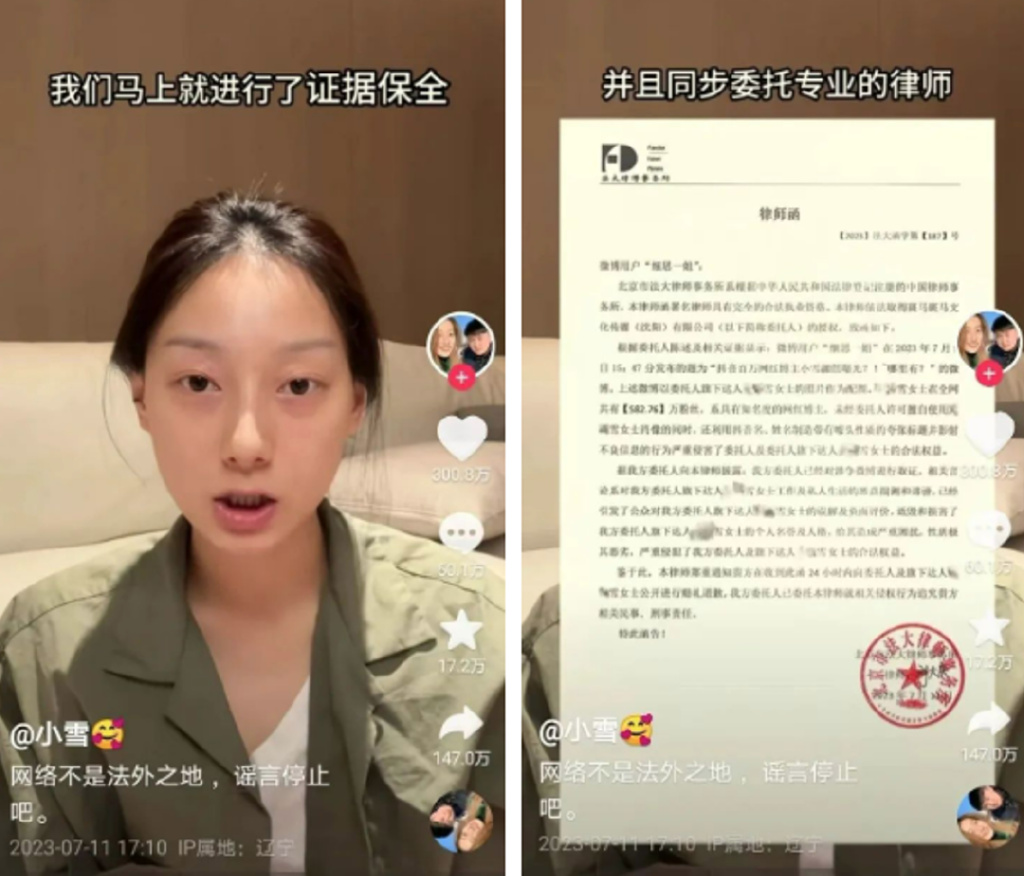 7月11日,小雪发布长视频就此事发声,称已向法院起诉,将通过合法合规的路径让造谣者“一个都跑不了”。
