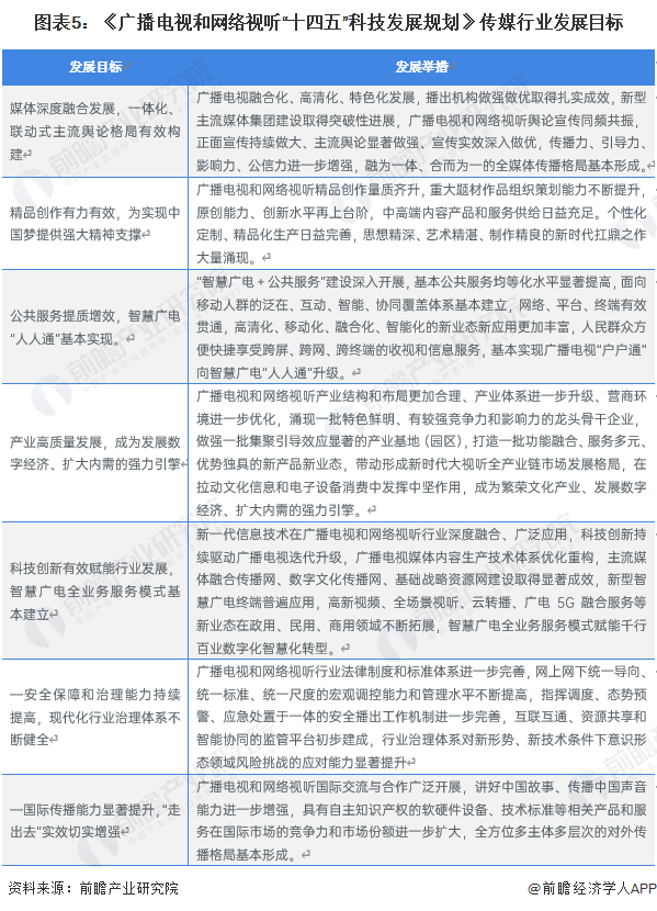 近年来国家层面传媒行业不断出台,政策以推进深度融合发展为主。2021年10月,国家广播电视总局发布了《广播电视和网络视听“十四五”科技发展规划》,其中传媒相关内容如下:
