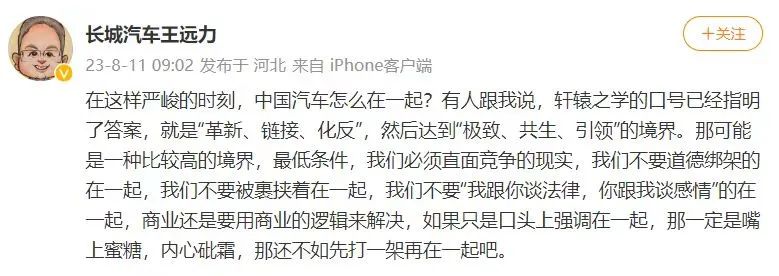8月11日,长城汽车 CTO王远力在个人微博表示,中国汽车企业必须直面竞争的现实,“我们不要被道德绑架的在一起,我们不要被裹挟着在一起。如果只是口头上强调在一起,那一定是嘴上蜜糖,内心砒霜,那还不如先打一架再在一起吧。”