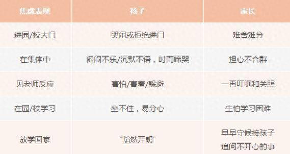 “分离焦虑更易出现在新入园或入学的孩子中,具体表现可能包括:情绪低落或烦躁、对平时有兴趣的事失去兴趣、胃口变差,严重者甚至会出现不明原因的发烧、呕吐、注意力不集中、难以完成作业、失眠等症状。”金星明说,此外,很多人会以为,分离焦虑主要是孩子们的焦虑,殊不知很多时候,家长们的焦虑也不亚于孩子。“特别是那些平日里溺爱孩子、凡事替孩子包办的家长,其焦虑程度往往会高于孩子本人。因此,无论孩子还是家长,面对分离焦虑,两者均须干预。”