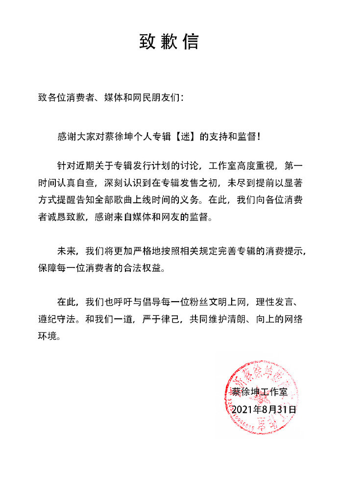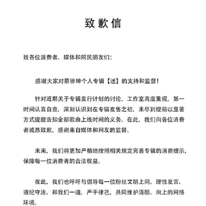 【#蔡徐坤工作室为赊歌事件道歉#】 31日,@蔡徐坤工作室 就专辑预售争议问题发致歉信,称工作室深刻认识到专辑发售之初,未尽到提前以显著方式提醒告知全部歌曲上线时间的义务,对此向消费者道歉,并感谢大家的监督,表示以后将会严格按照规定完善专辑的消费提示,保障消费者合法权益。