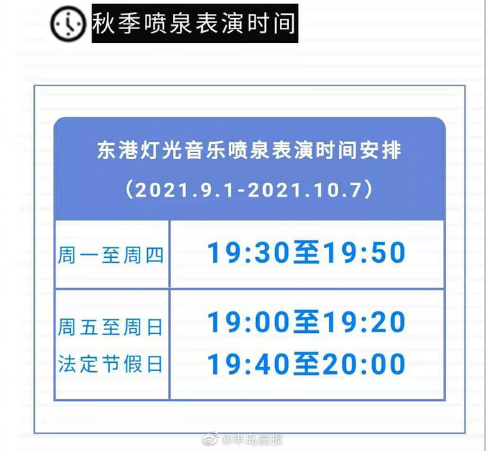 【#大连东港灯光音乐喷泉表演时间有调整#】大连东港灯光音乐喷泉表演时间调整了!2021年9月1日至10月7日,东港灯光音乐喷泉表演时间为周一至周四19时30分至19时50分;周五至周日及法定节假日19时至19时20分和19时40分至20时。