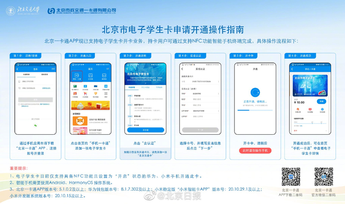 【#北京将推行电子学生卡# #北京电子学生卡坐公交享2.5折优惠#,北交大试点应用】记者从北京一卡通获悉,为顺应移动支付潮流,一卡通将为符合条件的高校在校生免费配发集身份识别、乘车优待、市政交通一卡通等多重功能于一体的“北京市电子学生卡”,其中北京交通大学率先试点应用。 此次推行的电子学生卡,不仅与实体卡享有相同的乘车优待,即乘坐北京地面公交常规线路(不包括市域内的旅游观光、快速直达、定制公交等多样化服务线路)时可享2.5折乘车优惠,还具有安全高效、便捷申领、全国通用等诸多特点。 据北京一卡通介绍,为提升学生群体用卡的便捷性,电子学生卡从申领到充值,再到每学年的卡片延期,整个用卡流程均支持在线自助办理,这将彻底解决学生卡用户需到指定发卡充值网点办理充值及延期业务的使用痛点。 在卡片申领环节,只要是符合条件的高校在校生,便可通过支持NFC功能的智能手机在线开通。具体方法为登陆最新版“北京一卡通”APP并确保已开通过手机一卡通(卡面需带有“交通联合”标识),再在“手机一卡通”中选择“添加一张电子学生卡”,按页面提示输入学校、姓名、学号、证件号等信息进行实名认证,待认证完成后原手机一卡通即可成功升级为电子学生卡。目前,华为、小米品牌手机(具备NFC功能机型)已率先支持电子学生卡开卡服务,接下来更多手机品牌也将陆续支持。 需要注意的是,由于同一学生身份信息只能开通一张使用状态正常的电子卡或实体卡,如申领人之前办理过高校学生卡实体卡,在开通电子卡后,原实体卡中的交通一卡通功能将不可再进行充值或延期操作,如后续需重新使用实体卡,可办理电子学生卡退卡并重新补办实体卡。 在使用时,只要将手机靠近公交或地铁的读卡设备即可自动感应刷卡,整个刷卡过程无需联网、无需解锁手机,更无需打开任何APP。 与此同时,电子学生卡的交通一卡通功能采用的是“交通联合”标准,不仅支持北京公共交通领域应用,还可在全国已实现交通一卡通互联互通的城市刷卡乘坐公交、地铁等(在其他城市使用时需以当地政府及运营企业发布的使用范围及票制票价政策为准),这也为学生假期返乡后乘坐当地公共交通提供了更多便利。 目前,电子学生卡已在北京交通大学试点应用,自秋季学期开学起,北交大全体在校生即可在线申领,率先感受电子卡带来的智能高效体验。接下来,这项创新应用将逐步覆盖更多高校,切实满足广大学子的便捷出行需求。(@北京日报 记者 李博)
