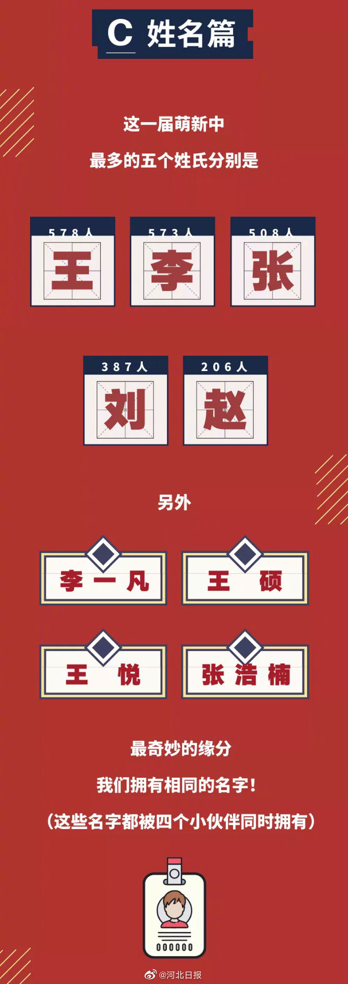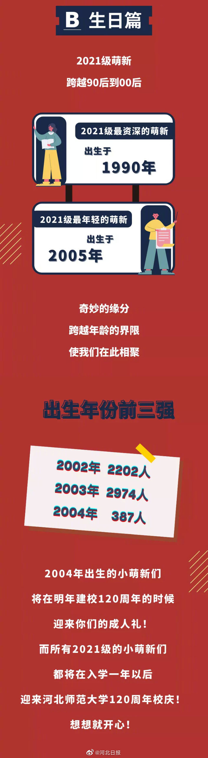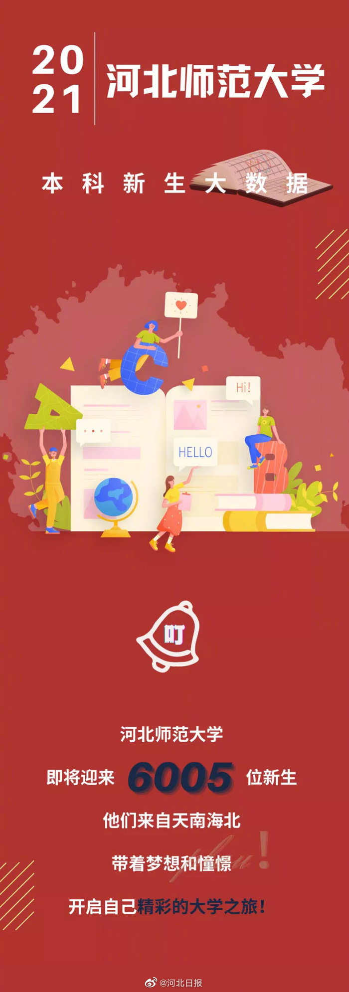 【#河北师大公布本科新生大数据#:最小萌新2005年出生,男女比例3:7】9月2日,@河北师范大学 发布2021级本科新生大数据。今年河北师大共迎来6005位新生,其中生源地来自河北的共有4491人,最年轻的萌新出生于2005年。在备受关注的新生男女比例方面,还是意料之中的3:7。姓名、专业、生源等更多大数据↓↓↓#河北高校男女比例#[编辑|王伟]