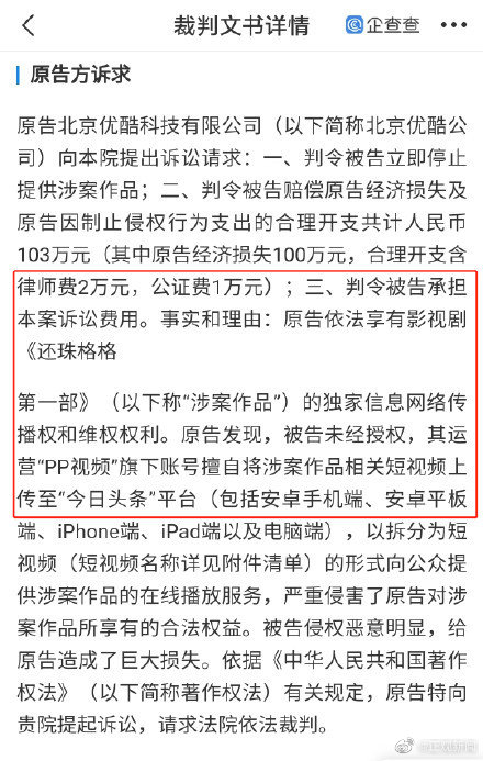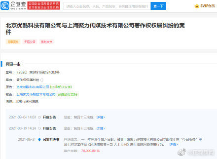 【#优酷诉pp视频播还珠格格获赔15万# 】企查查APP显示,9月6日,北京优酷科技有限公司与上海聚力传媒技术有限公司2则著作权权属、侵权纠纷一审民事判决书公开,原告称其依法享有影视剧《还珠格格》第一、三部的独家信息网络传播权及维权权利,被告未经授权,其运营“PP视频”旗下账号擅自将涉案作品相关短视频上传至其他平台向公众提供在线播放服务,涉嫌侵权。法院认为,被告在线上传涉案作品的行为确为侵犯原告依法享有的信息网络传播权,判决结果为被告停止侵权行为并分别赔偿优酷80000元、70000元。
