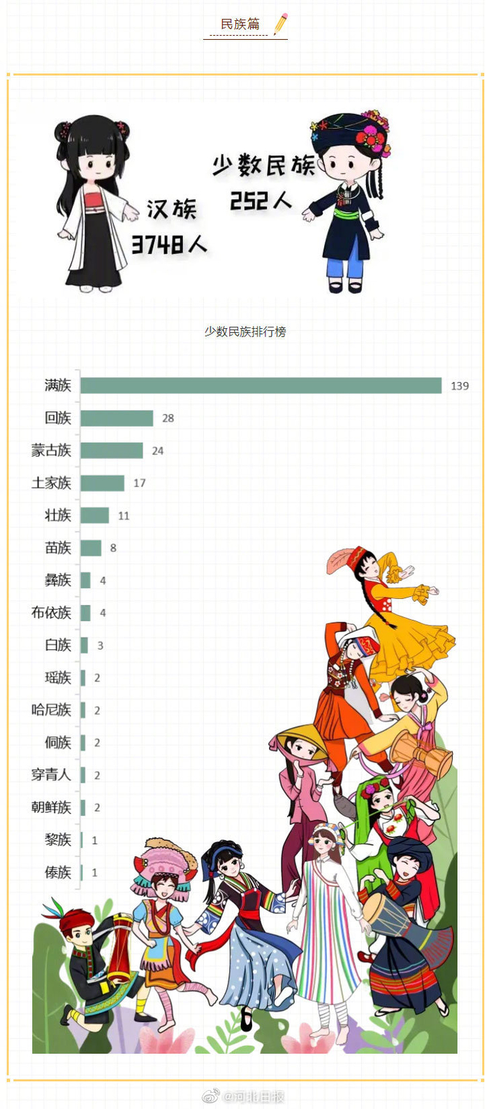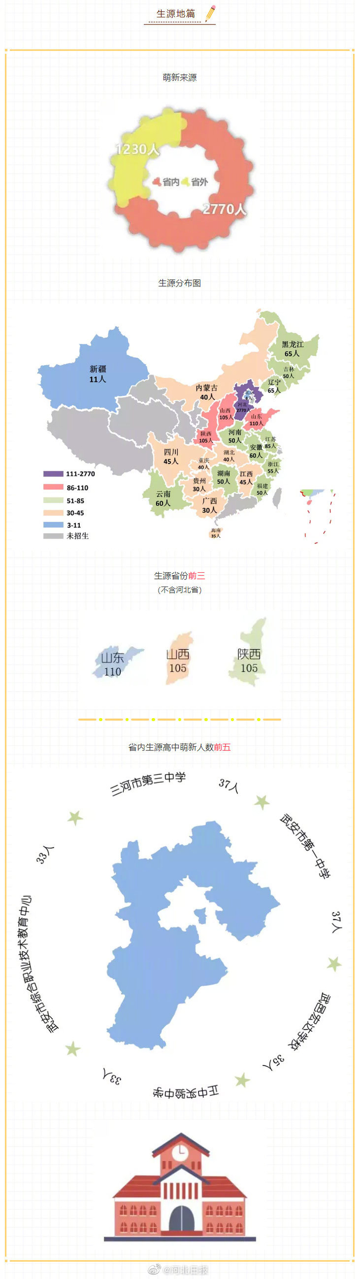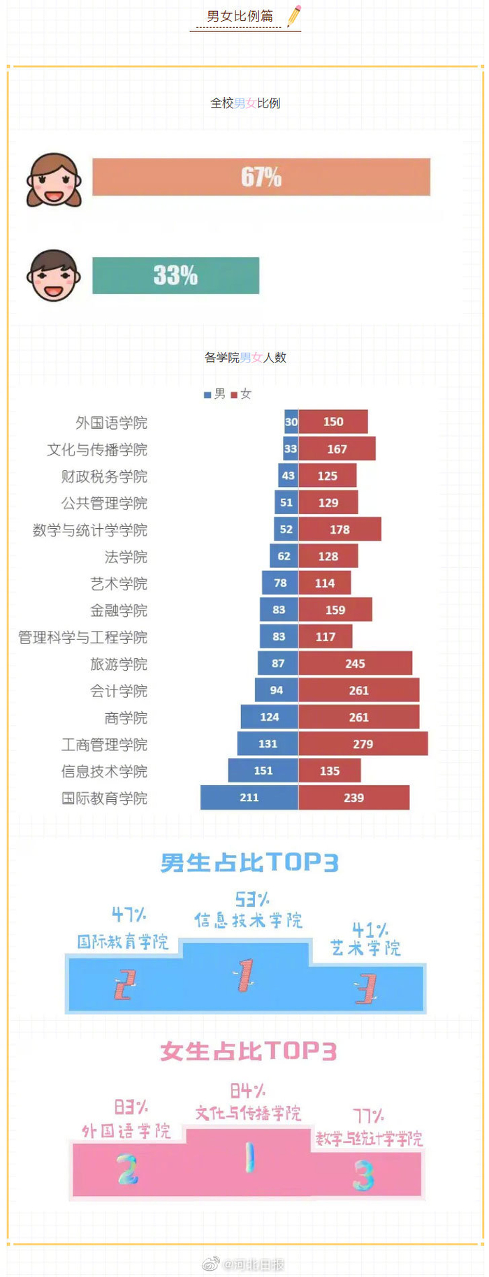 【#河北经贸大学新生大数据# :男女比例33%:67%,最小萌新仅14岁】近日,@河北经贸大学 发布2021新生大数据。2021年,河北经贸大学共计招生4000人,其中省内生源2770人,省外萌新1230人,省内生源高中萌新人数最多的是三河市第三中学和武安市第一中学,均为37人。全校男女比例为33%:67%,女生占比最高的学院为文化与传播学院(84%),男生占比最高的则是信息技术学院(53%)。姓氏、民族、生日等更多新生大数据↓↓↓#河北高校男女比例#[编辑|王伟]