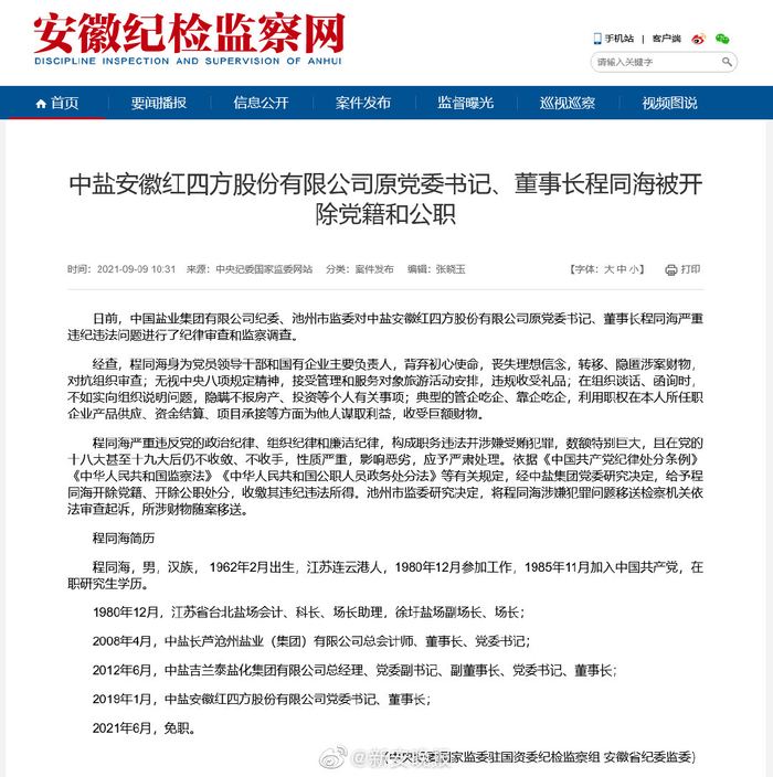 中盐安徽红四方原党委书记董事长程同海被双开