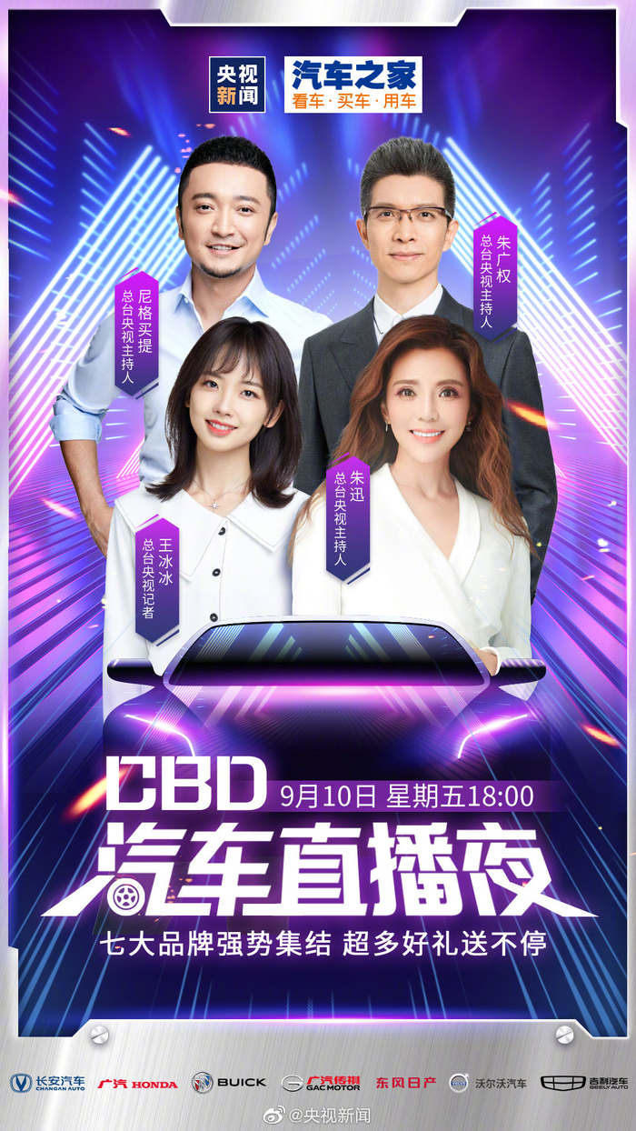 【朱广权、尼格买提、王冰冰、朱迅带来车届直播盛事!】今日18:00,@朱广权 @尼格买提 王冰冰@吃花椒的喵酱 朱迅空降#CBD汽车直播夜#,联手@汽车之家 打造车届直播盛事!总台主持人+奥运冠军+汽车之家测评专家在线指导选车,超多福利送不停,还有5万元锦鲤购车金!@央视新闻 和@汽车之家 同步直播!