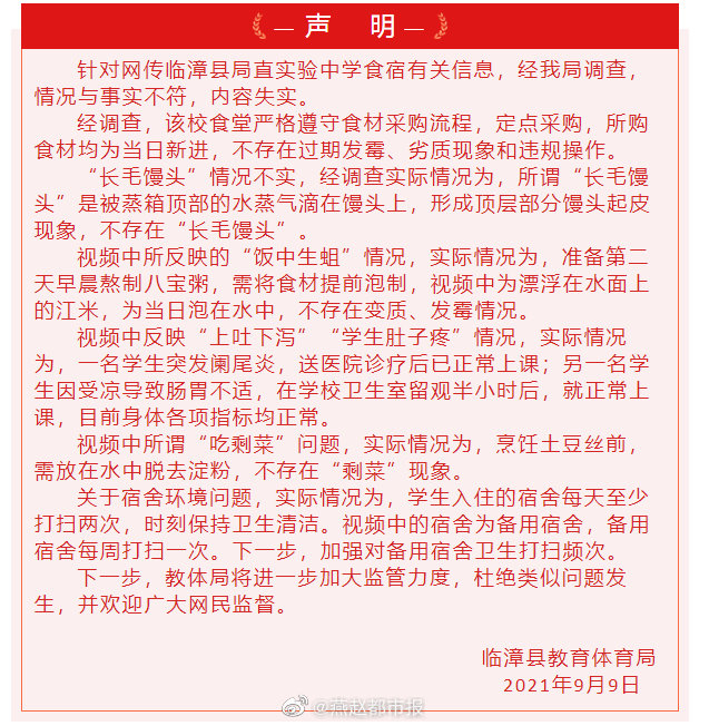 】9月9日,邯郸临漳县教育体育局发布最新声明:针对网传临漳县局直实验中学食宿有关信息,经我局调查,情况与事实不符,内容失实。