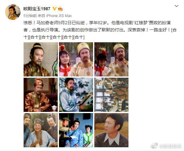#红楼梦贾政扮演者去世# 刚刚,@欧阳宝玉1987 发微博透露,87版《红楼梦》贾政扮演者马加奇老师9月2日已仙逝,享年82岁。“他也是执行导演,为该剧的创作做出了默默的付出。深表哀悼!一路走好!”#马加奇去世#