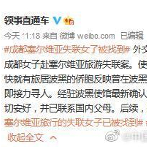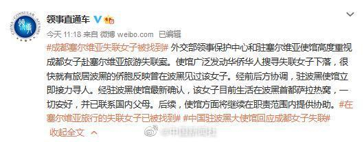 【外交部领事保护中心:#塞尔维亚旅游失联女子已确认在波黑#】据@领事直通车 消息,外交部领事保护中心和驻塞尔维亚使馆高度重视成都女子赴塞尔维亚旅游失联案。使馆广泛发动华侨华人搜寻失联女子下落,很快就有旅居波黑的侨胞反映曾在波黑见过该女子。经前后方协调,驻波黑使馆立即接力寻人。经驻波黑使馆最新确认,该女子目前生活在波黑首都萨拉热窝,一切安好,并已联系国内父母。后续,使馆方面将继续在职责范围内提供协助。