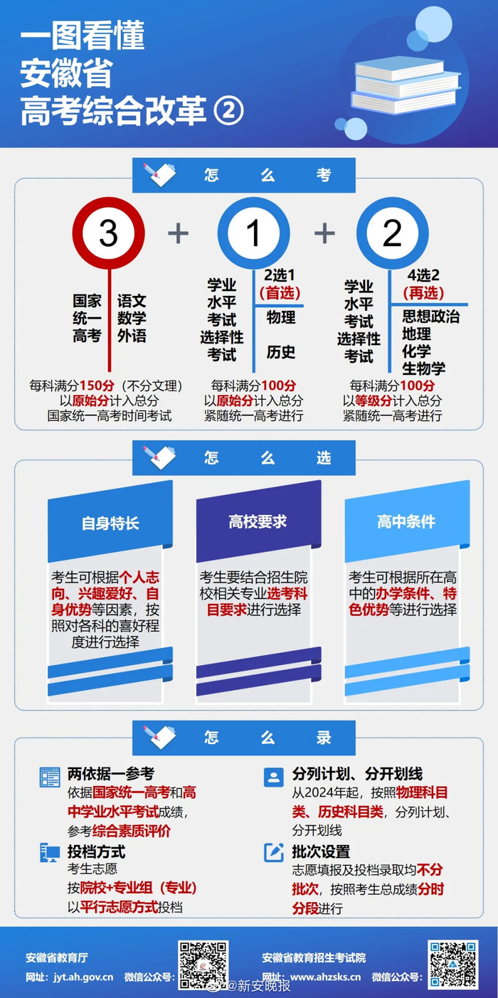 【重磅!#安徽新高考改革方案正式公布#:#安徽新高考方案取消文理分科#】9月15日下午4点,安徽省召开新闻发布会正式公布《安徽省深化高等学校考试招生综合改革实施方案》。 根据改革方案,计入高考总分的考试科目共有6门,即“3+1+2”。“3”为语文、数学、外语3门全国统一考试科目,不分文理科,使用全国卷。选择性考试科目为思想政治、历史、地理、物理、化学、生物学6门。由考生根据报考高校要求,结合自身特长兴趣,首先在物理和历史中选择1门,再从思想政治、地理、化学、生物学中选择2门。 选择性考试从2024年开始实施,每年组织1次,考试时间紧随全国统一高考进行。考试由省里统一命题、统一考试、统一组织阅卷、统一公布成绩,考试成绩当年有效。