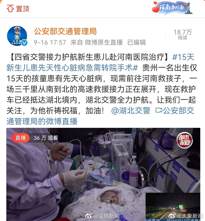 #15天先心病婴儿跨3000里赴郑急救# 【15天婴儿已顺利到郑,今天(9月17日)上午手术即将手术】#先心病婴儿已顺利到郑# 横跨黔湘鄂豫,一场三千里的生命接力赛。9月17凌晨,令千万网友揪心关注的15天婴儿,横跨黔湘鄂豫四个省,平安来到郑州。最新消息,孩子已在河南省胸科医院住下,之后,经过系列准备和检查,预计9月17日上午,专家将为孩子手术。 【横跨4省,万千网友网上送祝福】 “加油,宝宝你是最棒的!” “一定要好起来,我等你长大后炫耀,一出生就被公安部护送跨四省!” “作为孩子妈妈,看得心都碎了,小乖乖啊,你要给力点啊,叔叔阿姨们隔着屏幕爱你哟。” “11个月宝宝的宝妈,边看边流泪,加油小宝宝!爸爸妈妈在等你,未来在等着你!” ……贵州一名刚出生15天的男婴,被确诊为心下型肺静脉异位引流。这是一种罕见的先天性心脏病,如果不及时做手术,只能存活一个月。 患儿情况危急,生命以分钟计算…… 一场跨越四个省,三千里生命接力在贵州和河南郑州之间相连。万千网友关注孩子的转运,揪心孩子的治疗。 【氧气瓶不能带上飞机和高铁,孩子只能依靠120救护车进行转运】 记者了解到,最初接到贵阳市金阳医院的紧急求助后,来自河南的医疗团队河南省胸科医院专家团队第一时间赶到贵州,并进行初步诊断。 河南省胸科医院小儿心脏外科主任谌启辉介绍:“孩子情况不是很好,现在他只能勉强维持”。 因各种综合条件考虑,孩子需立即转运到河南进行手术。贵州、河南相隔上千公里单单车程就要大约18个小时以上,一场跨越四个省,三千里生命接力开始。 飞机?高铁?各种交通工具都考虑了,因为还需要系列急救设备。同时,因为氧气瓶不能带上飞机和高铁,孩子只能依靠120救护车进行转运。 【患儿情况危急,生命以分钟计算……】 沿途跨越一千多公里,需要大约18个小时以上的车程。孩子仍然处于危险中,因此转运的安全非常重要。为此,贵州公安专门为转运开启了绿色通道。公安部交管局得知消息后,也第一时间联系了河南省交警总队协调沿途经过的贵州、湖南、湖北、河南四省安排交警全程护送孩子到河南进行手术 9月16日上午9点半左右,孩子开始了一段令全国网友揪心的启程转运至河南,并于9月17日凌晨顺利抵郑。 孩子母亲目前还在月子中即使身体很虚弱她仍坚持一定要陪着孩子转院到河南。家人很揪心,说孩子一出生,就很可怜。他们还没亲自抱上一次。 据了解,孩子在医院住下后,将经过系列准备工作,计划于9月17日上午开展手术。 并且因为孩子较小,病情复杂,并且孩子情况也不是很好,此次手术将面临巨大挑战。 【猛犸新闻将直播手术,持续报道】 孩子能否顺利手术,手术过程中会有哪些情况,后期恢复会有哪些挑战?@猛犸新闻 将持续第一时间关注。(猛犸新闻 记者 董彩红)