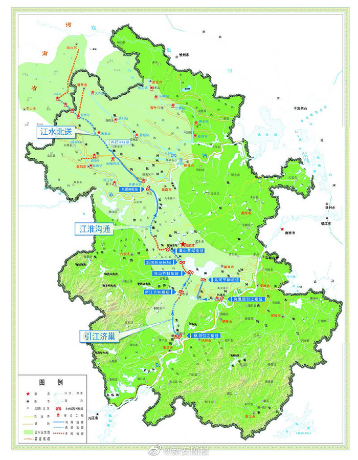 【#引江济淮二期已有初步施工图#:规划涉及安徽13市 计划分六大板块】目前,引江济淮二期工程已经有了初步“施工图”。在维持引江济淮工程供水范围、引江流量、线路布局等规划条件不变的基础上,二期工程将聚焦供水保障、粮食生产、航运发展、生态保护,以实现城乡供水、江淮航运、生态修复三大功能为主要任务。 按照目前的考虑,二期工程规划范围涉及安庆、铜陵、芜湖、马鞍山、合肥、六安、滁州、淮南、阜阳、亳州、蚌埠、淮北、宿州13个市,总面积约6.77万平方公里。初步计划,分为输水干线贯通、城乡集中供水、河渠水系连通、航运网络扩能、干线水质保护、智慧管理系统等六大板块。 二期项目将建设沙颍河、涡河两条输水干线,把江水送入阜阳、亳州两市腹地;利用淮水北调工程扩大与延伸,保障宿州和淮北城市用水,并把江水送到萧县和砀山;建设干线分水口门至城乡用水户之间的输水设施,将江水分配至有关水厂,形成完整配水体系。 输水干线工程建成后,干线分水口门及至城市、乡镇、工业园区等水厂前池之间的输水通道必须尽快建设,以发挥引江济淮工程供水效益。为连接干线水源和引到水量,在引江济淮和淮河以北四条输水干线上,计划新建26处城乡集中供水工程,并布设取水口门至各城镇和园区水厂前池的输水管线、加压泵站、末端调蓄等工程内容。 依托引江济淮输水通道和水源条件,二期工程将利用现有灌溉渠系和河湖水系,辅以必要的水系连通和水量调度,构建江淮骨干水网,建设合肥等重要城市备用水源,并可相机补充江淮分水岭、淮北平原等地区农业应急抗旱水源,为助推淮北地下水压采和河湖生境修复创造条件。 为尽快形成安徽省南北水运高等级航道网络,在江淮沟通段,结合在建一线船闸,计划增建派河口、蜀山、东淝河3座复线船闸;在菜子湖线,增建枞阳、庐江、白山等3座复线船闸;延伸整治杭埠河航道、淠淮航道、庄墓河航道并与江淮运河相连;新建港口物流园和航运保障服务系统等。 调水水质的好坏决定着调水工程的成败。为控制入河污染负荷总量,保障引江济淮江淮沟通派河段清水输送通道和西淝河线作为“清水廊道”的输水安全,二期还将实施派河截导污和西淝河沿线水质保护工程。此外,计划结合一期信息化系统,建设智慧管理系统。 安徽省发改委表示,引江济淮二期工程是主体工程不可分割的有机组成部分,工程尽快实施对发挥引江济淮工程整体效益,实现皖北群众早日喝上更好水具有重要意义。 整个项目建成之后,还可以支撑合肥都市圈和淮河生态经济带高质量发展,努力打造一河安澜图、一渠清泉水、一道风景线、一湖碧水梦、一岭翠绿画、一条经济带。(合肥晚报)
