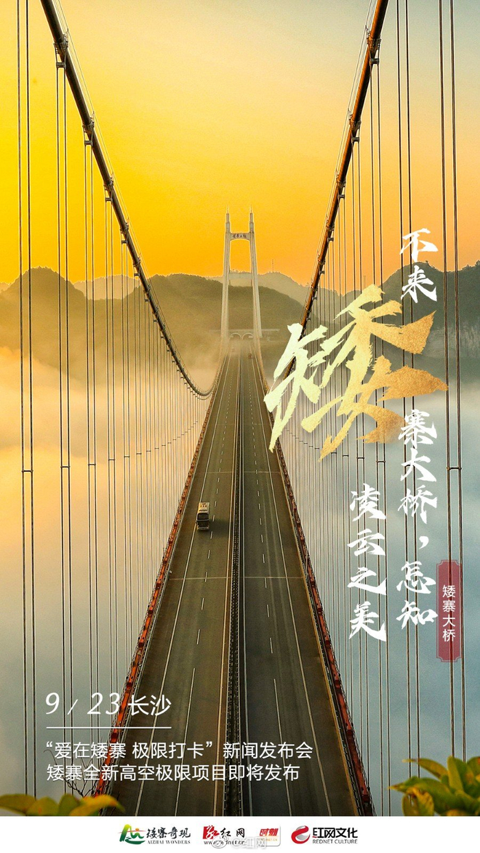 【矮寨景区上新了!矮寨奇观旅游区5大高空项目今日惊艳亮相】9月23日,#爱在矮寨 极限打卡#升级到5A景区的矮寨奇观旅游区,在长沙召开新闻发布会,10月起,全新刺激的飞拉达、云中漫步、高空秋千、高空蹦极、高桥矩阵等五大高空极限项目,将陆续开放。