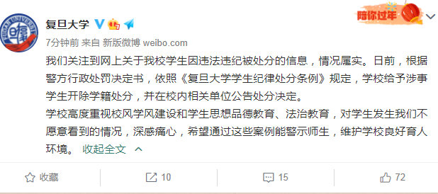 #红星评论#【校内公示开除3名嫖娼学生,复旦是否侵犯隐私权】近日,复旦大学的3份处分决定书引发舆论强烈关注。争议主要有两点:一是处分的是3名复旦大学研究生,因嫖娼而被开除学籍;二是复旦大学的处分决定书被公开了。 事实上,复旦大学并没有在网络上公开处分决定书,而是在学校内以张贴处分决定书的形式予以公告。而处分决定书中涉事学生嫖娼的内容以警方行政处罚决定书为根据,那么,学生在校外嫖娼被处罚,要不要通知学生所在学校就是一个问题。 治安管理处罚法第97条规定,公安机关应当向被处罚人宣告并交付治安管理处罚决定书。决定给予行政拘留处罚的,应当及时通知被处罚人的家属。并没有说通知被处罚人的单位或学校。也就是说,公安机关并没有义务和职责通知学生所在学校。 但是,公安机关将处罚情况告知学校似乎也并不为过。因为3名涉事学生均被处以了行政拘留,而且所实施的是严重违背社会风尚、性道德的嫖娼行为。特别是学生在校期间突然出现数日失联,学校作为学生的管理部门也应当对学生的行踪有所掌握。如果学生一旦发生危险,学校难辞其咎。不必非要等到学校找来,公安机关才实话实说。 有网友认为学校的处分过重,应该给学生机会,毕竟他们都是高学历人才,其中一名还是多次获奖的博士研究生。不过,根据教育部《普通高等学校学生管理规定》第52条,受到治安管理处罚,情节严重、性质恶劣的,可以给予开除学籍处分。复旦大学开除3名学生于法有据。 再者,《复旦大学学生纪律处分条例》第40条规定,卖淫、嫖娼或者组织、强迫、引诱、容留、介绍他人卖淫的,给予开除学籍处分。因此,3名学生因嫖娼而被开除,也有校纪校规的根据,不存在轻重之说。 当然,争议最为热烈的还是学生嫖娼是否属于隐私,复旦大学能否将这样的信息在处分决定书中公布出来,哪怕是在校内公告栏公开。在这里,首先需要明确的是何为隐私。在民法典的定义中,隐私是自然人的私人生活安宁和不愿为他人知晓的私密空间、私密活动、私密信息。任何组织或者个人不得以刺探、侵扰、泄露、公开等方式侵害他人的隐私权。 那么,嫖娼这样的违法行为是否属于个人隐私呢?个人隐私当然值得保护,但是保护在法律上也是有界限的。嫖娼行为是对社会性道德、善良风俗的侵犯,当所谓个人不愿意公开的“隐私”与社会公共利益发生冲突时,则需要权衡两者之间的关系。 从法律性质和程序来看,对嫖娼行为的行政处罚是公权力机关对违法行为的惩罚,而这样的惩罚结果是需要公开的。正如治安管理处罚法规定,实施治安管理处罚,应当公开、公正。这种公开既是使处罚决定接受监督,也未必没有对他人予以警示教育的意味。 因此,学校处分并公示的内容是学生违法被处罚的事实,即便在公示内容的信息表达上做得并非尽善尽美,也不宜过于苛求。事实上,复旦大学在此事引发热议后做出回应表示,学校是希望通过这些案例起到警示作用,维护学校良好的育人环境。惩罚的预防意义,有时甚至比惩罚本身更重要。 话还得说回来,对于此类事件,关注的重点应当是规范教育高校学生的日常行为,培养自尊自爱的当代大学生素养,抵制和摒除不良行为,而不是有没有“被社死”。