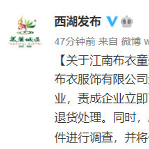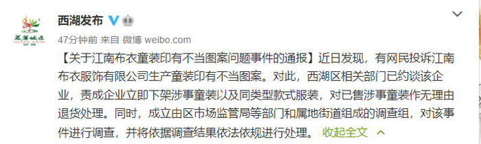 【#官方通报江南布衣童装不当图案问题#:责成下架,成立调查组】#杭州西湖区约谈江南布衣#杭州市@西湖发布 26日通报:近日发现,有网民投诉江南布衣服饰有限公司生产童装印有不当图案。对此,西湖区相关部门已约谈该企业,责成企业立即下架涉事童装以及同类型款式服装,对已售涉事童装作无理由退货处理。同时,成立由区市场监管局等部门和属地街道组成的调查组,对该事件进行调查,并将依据调查结果依法依规进行处理。