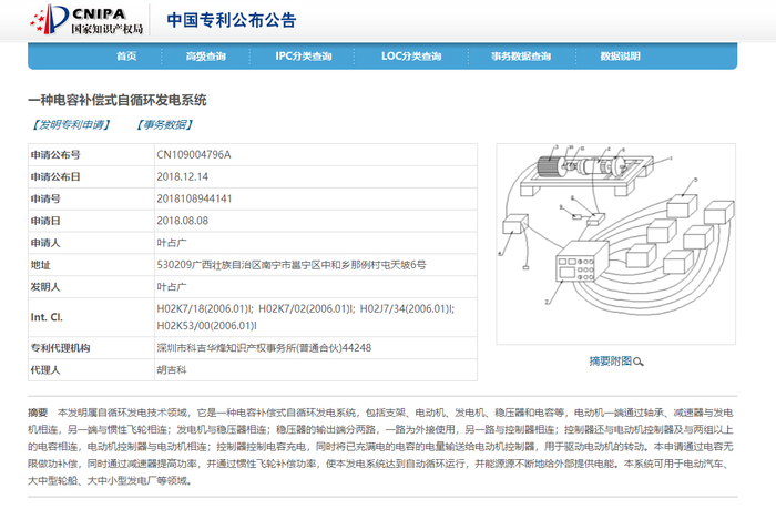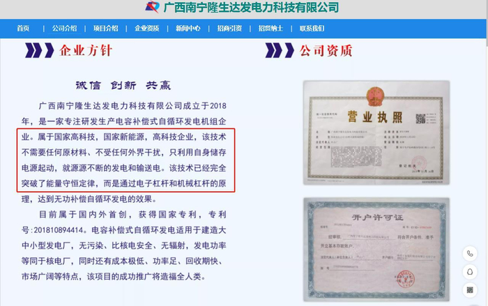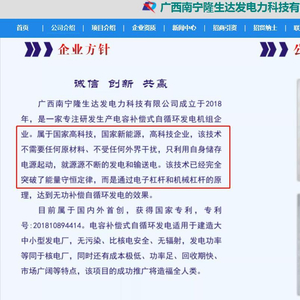 【#广西一企业自称发电技术突破能量守恒定律# 国家产权局:尚在审查】近日,限电潮席卷多地,成为各界关注的热点话题。红星资本局注意到,有企业声称研发了一种“不需要任何原材料、不受任何外界干扰”的发电技术,该技术已获得国家专利。该企业名为广西南宁隆生达发电力科技有限公司。据其官网介绍,该公司成立于2018年,是一家专注研发生产电容补偿式自循环发电机组企业,属于国家高科技,国家新能源,高科技企业。 而上述专利发电技术名为“一种电容补偿式自循环发电系统”,可以“不需要任何原材料、不受任何外界干扰,只利用自身储存电源起动,就源源不断的发电和输送电”。隆生达称,其“已经完全突破了能量守恒定律,而是通过电子杠杆和机械杠杆的原理,达到无功补偿自循环发电的效果”。