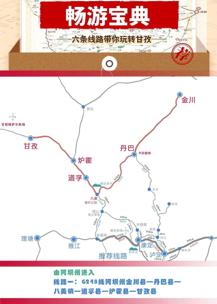 线路一:G248线 阿坝州金川县—丹巴县—八美镇—道孚县—炉霍县—甘孜县