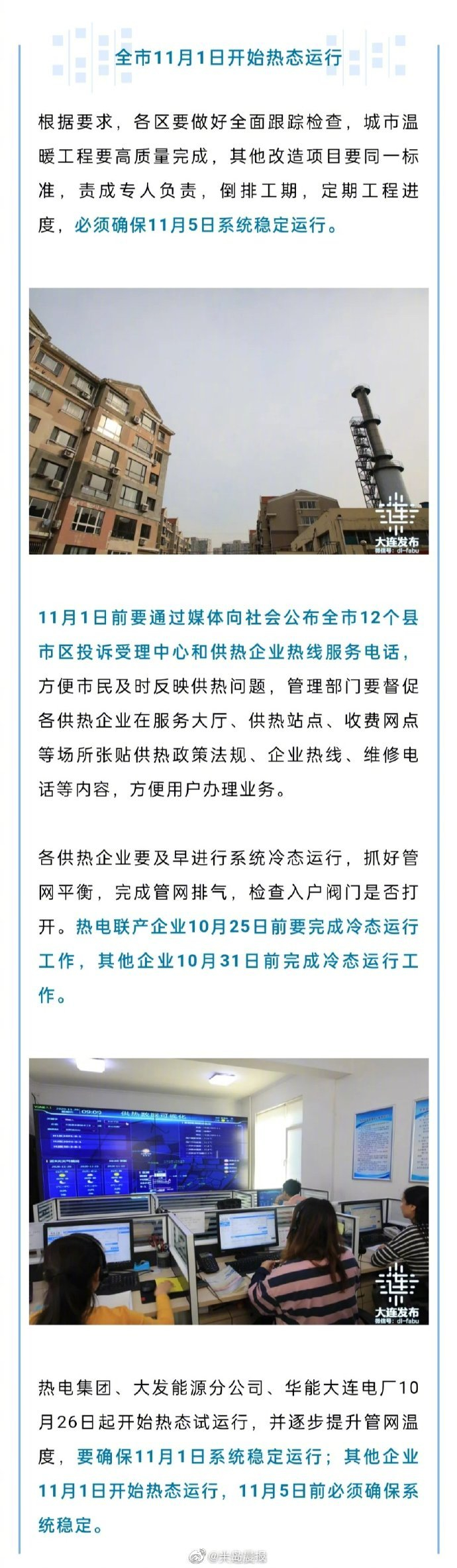 #大连供暖期#【大连11月1日开始热态运行】根据要求,城市温暖工程要高质量完成,11月1日前要通过媒体向社会公布全市12个县市区投诉受理中心和供热企业热线服务电话,方便市民及时反映供热问题。热电集团、大发能源分公司、华能大连电厂10月26日起开始热态试运行,并逐步提升管网温度,要确保11月1日系统稳定运行;其他企业11月1日开始热态运行,11月5日前必须确保系统稳定。