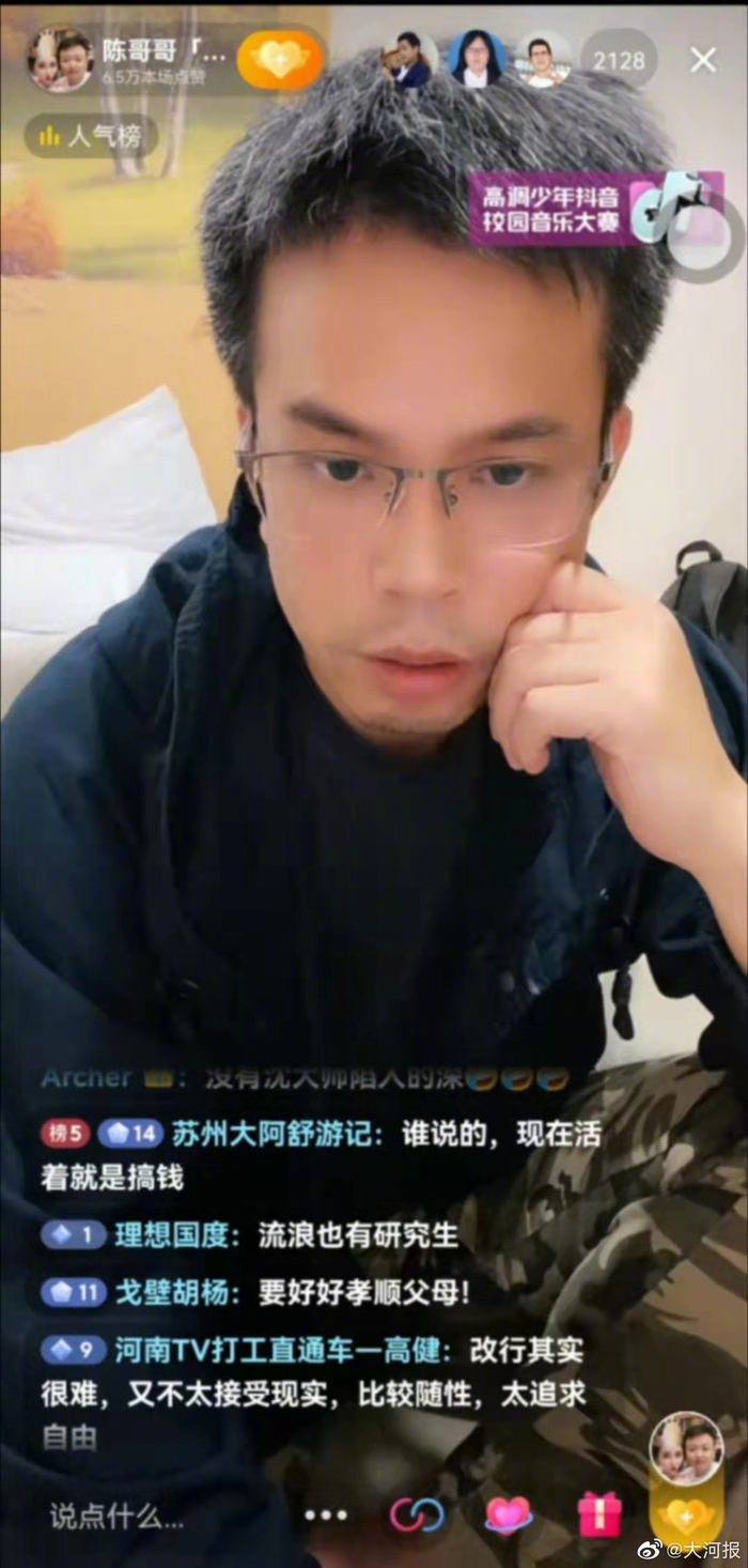 【前财经记者#宋湘波回应流浪街头是炒作#:规划流浪2年已接近尾声,不在乎别人看法】10月12日,宋湘波在直播中表示,他已经流浪一年多,是在体验生活,并非生活所迫。此外,宋湘波对质疑自己拿流浪街头来炒作的说法作出回应:“我只能说,我在向公众展示真实的自己,我走我的路,不在乎别人怎么看,我做我自己。”详见(大河报记者 张晶晶)