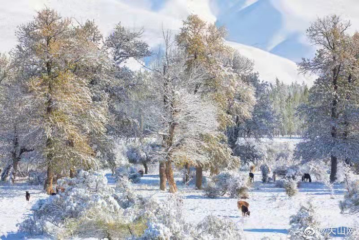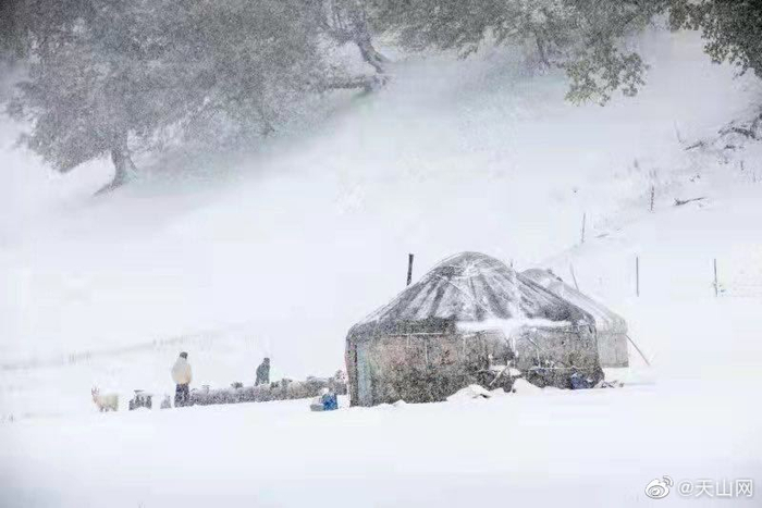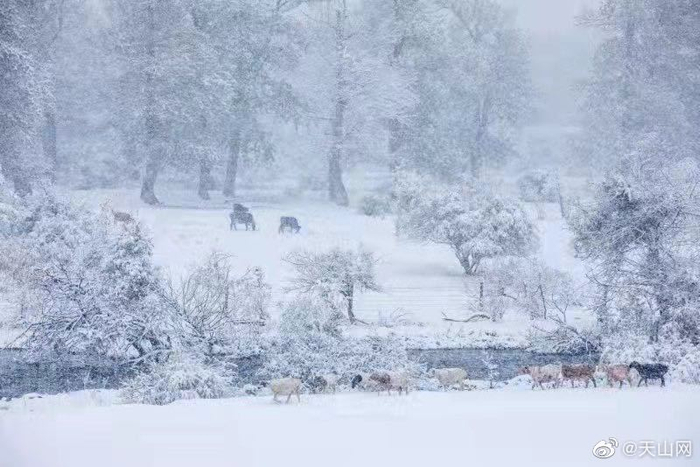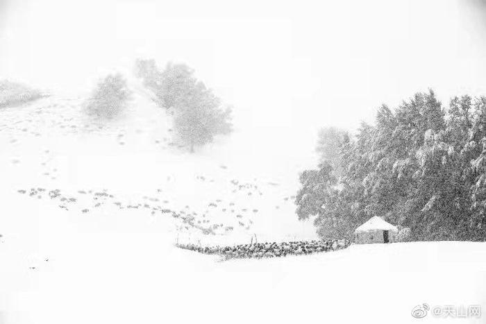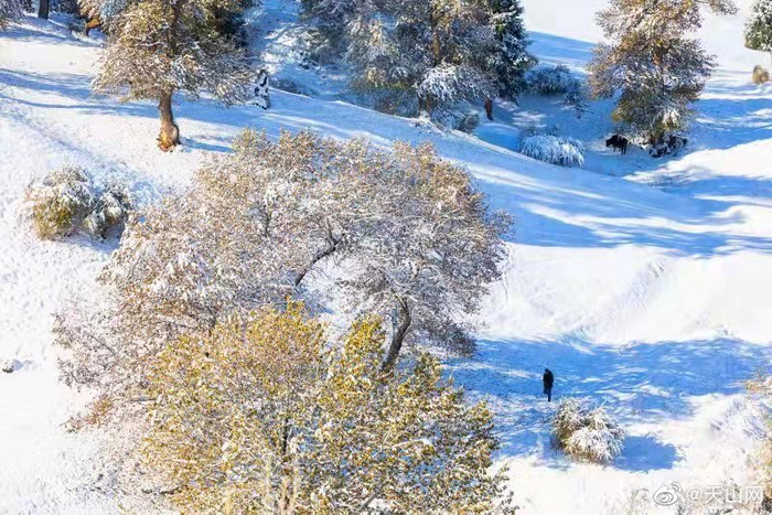 】秋叶未落的树木、牛羊成群的冬窝子、圆鼓鼓的毡房……10月7日,一场大雪过后,那拉提草原被点缀成了一幅水墨画。冬天的新疆,是一次又一次落雪的浪漫相遇。你喜欢下雪天吗?(邹学炯 摄)