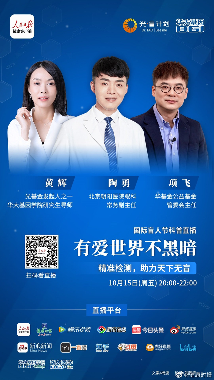 #国际盲人节# 我国是世界上盲人最多的国家,占世界盲人总数的18%-20%,每年新增的盲人数量高达45万,无论是先天性盲还是后天因疾病或意外造成的盲,都严重影响着患者的生活。 10月15日国际盲人节,人民日报健康客户端联合华大基因,推出“有爱世界不黑暗”国际盲人节科普直播节目,请眼科专家分享危害眼健康的相关疾病与发病机制,以及世界前沿眼病基因疗法进展等内容,欢迎收看。