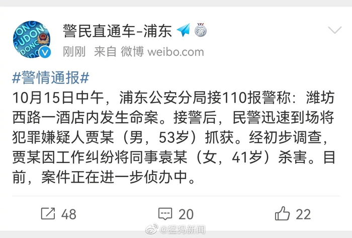 【#警方通报上海浦东全季酒店发生命案# 】10月15日中午,浦东公安分局接110报警称:潍坊西路一酒店内发生命案。接警后,民警迅速到场将犯罪嫌疑人贾某(男,53岁)抓获。经初步调查,贾某因工作纠纷将同事袁某(女,41岁)杀害。目前,案件正在进一步侦办中。
