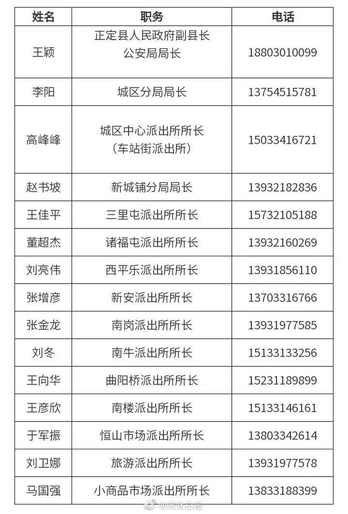 【#正定县公布公安局局长和派出所所长联系方式#】为进一步畅通警民沟通联系渠道,营造良好的营商环境,有效打击违法犯罪,维护社会治安秩序,共建平安和谐美丽正定,为建设现代化国际化美丽省会城市贡献正定公安力量。经局党委决定,现将局长及各派出所所长的手机号码向社会予以公布来源|掌上正定[编辑|李硕]
