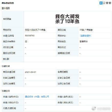 #我在大润发杀了十年鱼被注册商标# 【“我在大润发杀了十年鱼”被申请为注册商标!】企查查APP显示,近日,大润发申请网梗“我在大润发杀了十年鱼”商标,商标状态为注册申请中,目前大润发已认领该流行梗,并打造了限量款T恤。据悉,“你以为我会在乎吗,我在大润发杀了十年鱼,我的心早已像我杀鱼的刀一样冷了。”“我在大润发杀了十年鱼”常常被年轻人表达满不在乎的态度。