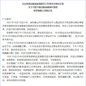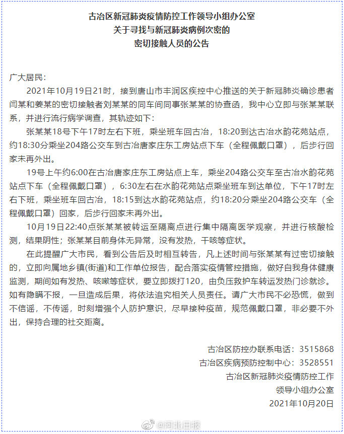 【#唐山古冶区次密接人员轨迹#,涉班车、公交车】唐山古冶区发布最新公告,2021年10月19日21时,接到唐山市丰润区疾控中心推送的关于新冠肺炎确诊患者闫某和姜某的密切接触者刘某某的同车间同事张某某的协查函,我中心立即与张某某联系,并进行流行病学调查,其轨迹如下: 张某某18号下午17时左右下班,乘坐班车回古冶,18:20到达古冶水韵花苑站点,约18:30分乘坐204路公交车到古冶唐家庄东工房站点下车(全程佩戴口罩),后步行回家未再外出。 19号上午约6:00在古冶唐家庄东工房站点上车,乘坐204路公交车至古冶水韵花苑站点下车(全程佩戴口罩),6:30左右在水韵花苑站点乘坐班车到达单位,下午17时左右下班,乘坐班车回古冶,18:15到达水韵花苑站点,约18:20分乘坐204路公交车(全程佩戴口罩)回家,后步行回家未再外出。 10月19日22:40点张某某被转运至隔离点进行集中隔离医学观察,并进行核酸检测,结果阴性;张某某目前身体无异常,没有发热,干咳等症状。 在此提醒广大市民,看到公告后及时相互转告,凡上述时间与张某某有过密切接触的,立即向属地乡镇(街道)和工作单位报告,配合落实疫情管控措施,做好自我身体健康监测,期间如有发热、咳嗽等症状,要立即拨打120,由负压救护车转运发热门诊就诊。如有隐瞒不报,一旦造成后果,将依法追究相关人员责任。请广大市民不必恐慌,做到不信谣,不传谣,时刻增强个人防护意识,尽早接种疫苗,规范佩戴口罩,非必要不外出,保持合理的社交距离。(古冶发布)[编辑|王伟]
