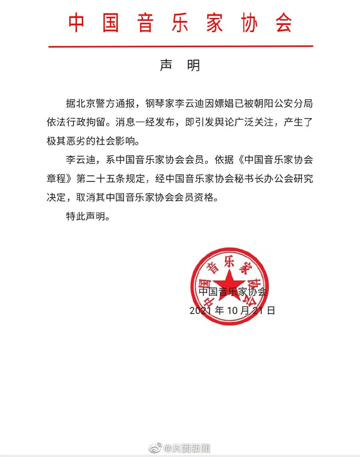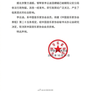 【#李云迪被取消中国音乐家协会会员资格#】#李云迪嫖娼被拘#,中国音乐家协会发布声明称,依据《中国音乐家协会章程》第二十五条规定,经中国音乐家协会秘书长办公会研究决定,取消其中国音乐家协会会员资格。(人民日报)