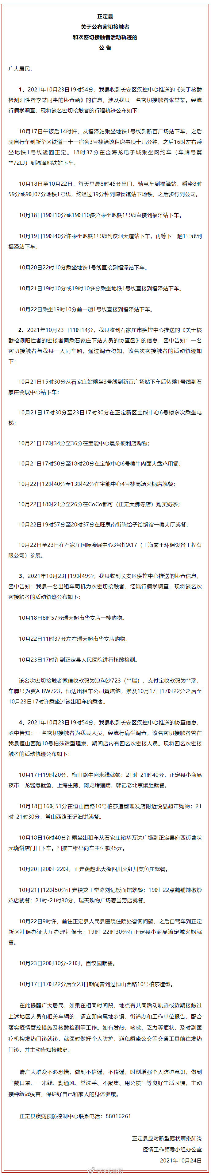 【#石家庄正定1名密接6名次密接轨迹#,涉地铁、餐馆、会展中心等】正定县发布关于公布密切接触者和次密切接触者活动轨迹的公告↓↓↓ 1、2021年10月23日19时54分,我县收到长安区疾控中心推送的《关于核酸检测阳性者李某同事的协查函》的信息,涉及我县一名密切接触者张某某。经流行病学调查,现将该名密切接触者的行程轨迹公布如下: 10月17日午饭后14时许,从福泽站乘坐地铁1号线到新百广场站下车,之后骑自行车到新华区铁道三十一宿舍3号楼洽谈租房事项十几分钟,之后16时左右乘坐地铁1号线返回正定。18时37分在金海龙电子城乘坐网约车(车牌号冀**72LJ)到福泽地铁站下车。 10月18日至10月22日,每天早晨8时45分出门,骑电车到福泽站,乘坐8时59分或9时07分地铁1号线,约经过39分钟到博物馆站下地铁,之后步行到公司。 10月18日19时10分或19时10多分乘坐地铁1号线直接到福泽站下车。 10月19日19时40分许乘坐地铁1号线到洨河大道站下车,再等下一趟1号线到福泽站下车。 10月20日22时10分乘坐地铁1号线直接到福泽站下车。 10月21日19时10分或19时10多分乘坐地铁1号线直接到福泽站下车。 10月22日乘坐19时10分前一趟1号线直接到福泽站下车。 2、2021年10月23日11时14分,我县收到石家庄市疾控中心推送的《关于核酸检测阳性者的密接者同乘石家庄下站人员的协查函》的信息,函中告知:一名密切接触者与我县一人同车厢。通过调查得知,该名次密接触者的活动轨迹如下: 10月21日15时30分从石家庄站乘坐3号线到新百广场站下车后转乘1号线到石家庄会展中心站下车; 10月21日17时30分至23日17时30分在正定新区宝能中心6号楼多次乘坐电梯; 10月21日17时34分至36分在宝能中心晨朵便利店购物; 10月21日17时50分至18时20分在宝能中心6号楼牛肉面大盘鸡用餐; 10月22日12时40分至13时42分在宝能中心4号楼高汤火锅店就餐; 10月22日18时21分至26分在CoCo都可(正定大佛寺店)购买奶茶; 10月22日19时57分至20时37分在旺泉南街陈饸子饸饹馆一楼大厅就餐; 10月22日至23日在石家庄国际会展中心3号馆A17(上海雾王环保设备工程有限公司)参展。 3、2021年10月23日19时49分,我县收到长安区疾控中心推送的协查信息,函中告知:我县一名出租车司机为次密切接触者,经流行病学调查,现将该名次密接触者的活动轨迹公布如下: 10月18日8时57分瑞天超市华安店一楼购物。 10月22日11时37分左右瑞天超市华安店购物。 10月23日17时许到正定县人民医院进行核酸检测。 该名次密切接触者微信收款码为浪淘沙723(**瑞),支付宝收款码为**瑞,车牌号为冀A BW723,恒达出租车公司桑塔纳,涉及10月17日17时22分之后至10月23日17时许乘坐过该出租车的乘客。 4、2021年10月23日19时54分,我县收到长安区疾控中心推送的协查信息,函中告知:一名密切接触者为我县人员,经流行病学调查,该名密切接触者曾在我县恒山西路10号柏莎造型理发,期间店内有四名次密接人员。现将四名次密接触者的活动轨迹公布如下: 10月17日19时20分,梅山路牛肉米线就餐;21时-21时40分,正定县小商品夜市一龙酱爆鱿鱼、上海生煎、阿龙烤猪蹄、韩记老北京爆肚就餐。 10月18日16时51分在恒山西路10号柏莎造型理发店附近悦品超市购物;21时-21时30分,常山西路王记油饼就餐。 10月18日16时40分许乘坐出租车从石家庄裕华万达广场到正定县府西街曹状元烧饼店门口下车。扫描二维码向车主付款45元。 10月20日20时-22时,正定燕赵北大街四川火红川菜鱼庄就餐。 10月21日12时50分正定镇龙王堂路刘记板面馆就餐;19时-22点魏铺辣椒炒鸡店就餐;21时-21时30分,瑞天购物广场麦当劳店就餐。 10月22日9时许,前往正定县人民县医院住院处咨询问题,之后自驾车到正定新区社保办证大厅办理社保卡;19时-22时30分在正定县小商品渝定城火锅就餐。 10月23日20时30分-21时,百饺园就餐。 10月17日17时22分后至23日期间曾到过恒山西路10号柏莎造型。 在此提醒广大居民,如果在相同时间段、地点有共同活动轨迹或近期接触过上述地区人员和相关车辆的,请立即向属地乡镇、街道办和工作单位报告,配合落实疫情管控措施及核酸检测等工作。如有发热、咳嗽、乏力等症状,及时到医疗机构发热门诊就诊,就医时做好个人防护,避免乘坐公交等交通工具前往发热门诊,并主动告知接触史。 正定县疾病预防控制中心联系电话:88016261 #石家庄一定行##加油河北#(掌上正定)[编辑|王伟]